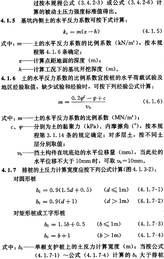 3 擋土結(jié)構(gòu)采用排樁時(shí),作用在單根支護(hù)樁上的主動(dòng)土壓力計(jì)算寬度應(yīng)取排樁間距,土反力計(jì)算寬度(b0)應(yīng)按本規(guī)程第4. 1. 7條確定(圖4.1. 3-2);