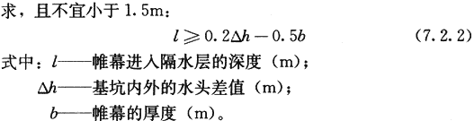 7.2.2 當(dāng)坑底以下存在連續(xù)分布、埋深較淺的隔水層時(shí),應(yīng)采用落底式帷幕。落底式帷幕進(jìn)入下臥隔水層的深度應(yīng)滿足下式要