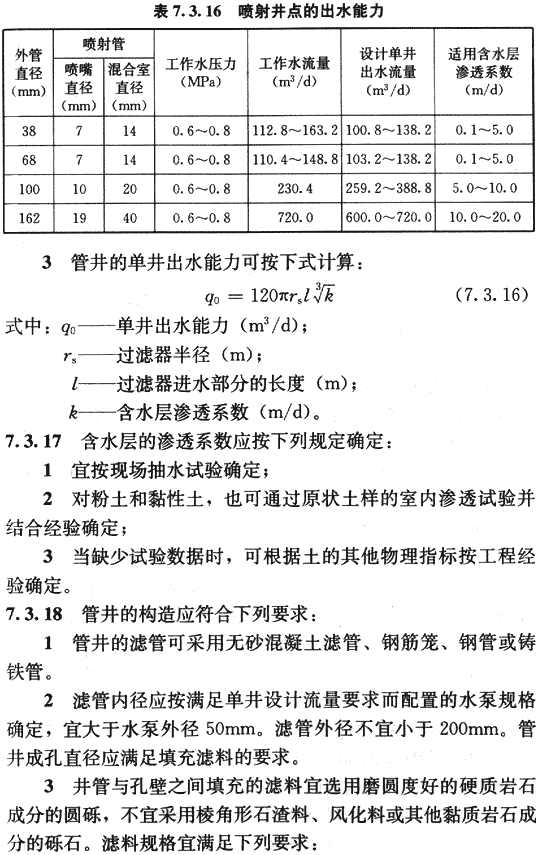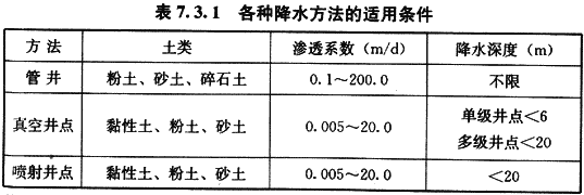 7.3.1 基坑降水可采用管井、真空井點(diǎn)、噴射井點(diǎn)等方法,并宜按表7.3.1的適用條件選用。