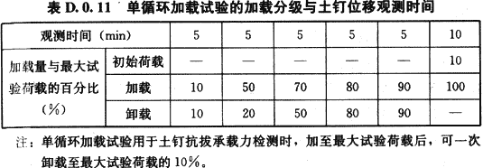 D. 0.11 確定土釘極限抗拔承載力的試驗(yàn)和土釘抗拔承載力檢測(cè)試驗(yàn)可采用單循環(huán)加載法,其加載分級(jí)和土釘位移觀測(cè)時(shí)間應(yīng)按表D.0.11確定。