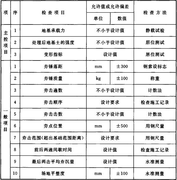 4.6.2 施工中應(yīng)檢查夯錘落距、夯點(diǎn)位置、夯擊范圍、夯擊擊數(shù)、夯擊遍數(shù)、每擊夯沉量、最后兩擊的平均夯沉量、總夯沉量和夯點(diǎn)施工起止時(shí)間等。