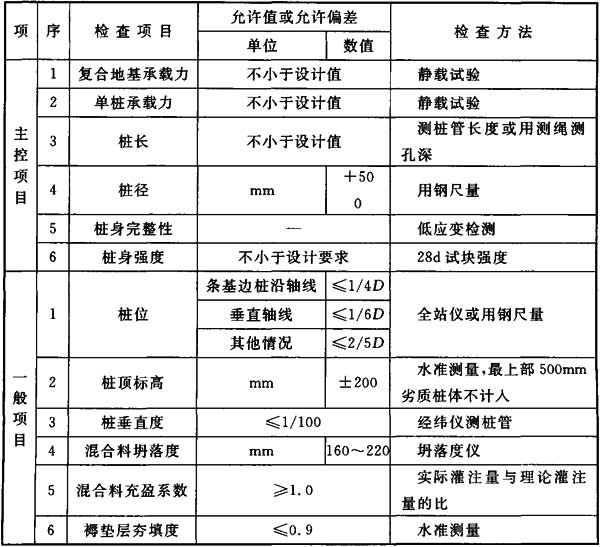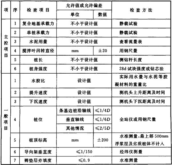 4.11.3 施工結(jié)束后,應(yīng)檢驗(yàn)樁體的強(qiáng)度和直徑,以及單樁與復(fù)合地基的承載力。