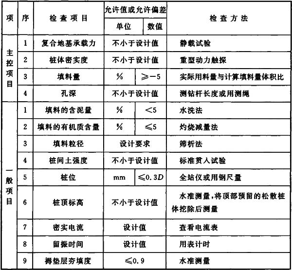 4.9.4 砂石樁復(fù)合地基質(zhì)量檢驗(yàn)標(biāo)準(zhǔn)應(yīng)符合表4.9.4的規(guī)定。