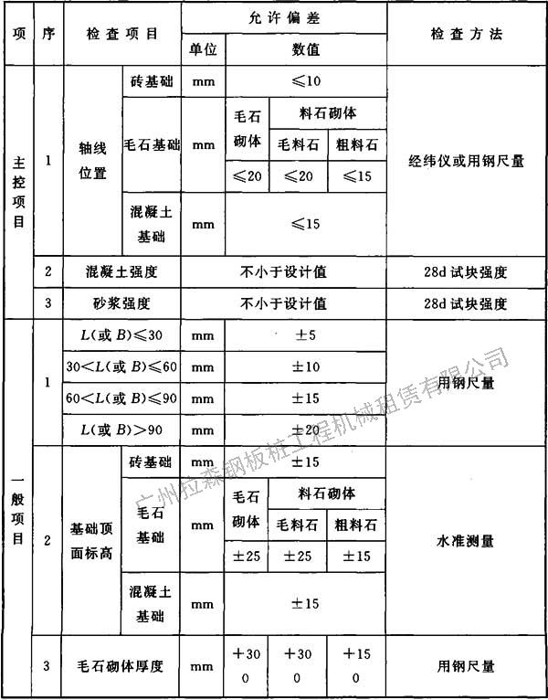 5.1.1 擴展基礎(chǔ)、筏形與箱形基礎(chǔ)、沉井與沉箱,施工前應(yīng)對放線尺寸進行復(fù)核;樁基工程施工前應(yīng)對放好的軸線和樁位進行復(fù)核。群樁樁位的放樣允許偏差應(yīng)為20mm,單排樁樁位的放樣允許偏差應(yīng)為10mm。