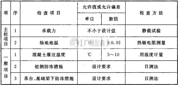 1)施工中應檢查樁身混凝土灌注溫度及負溫混凝土防凍劑、早強劑摻量;應檢查在多年凍土融化層內(nèi)的樁周外側(cè)和低樁承臺或基礎梁下防止基土凍脹作用的措施,并應符合設計要求;
