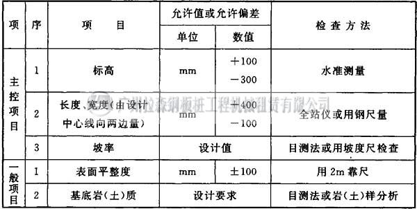 9.3.4 柱基、基坑、基槽、管溝巖質(zhì)基坑開挖工程的質(zhì)量檢驗標準應(yīng)符合表9.3.4的規(guī)定。