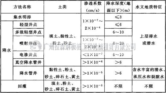 7.1.4 依據(jù)場(chǎng)地的水文地質(zhì)條件、基礎(chǔ)規(guī)模、開(kāi)挖深度、各土層的滲透性能等,可選擇集水明排、降水以及回灌等方法單獨(dú)或組合使用。常用地下水控制方法及適用條件宜符合表7.1.4的規(guī)定。
